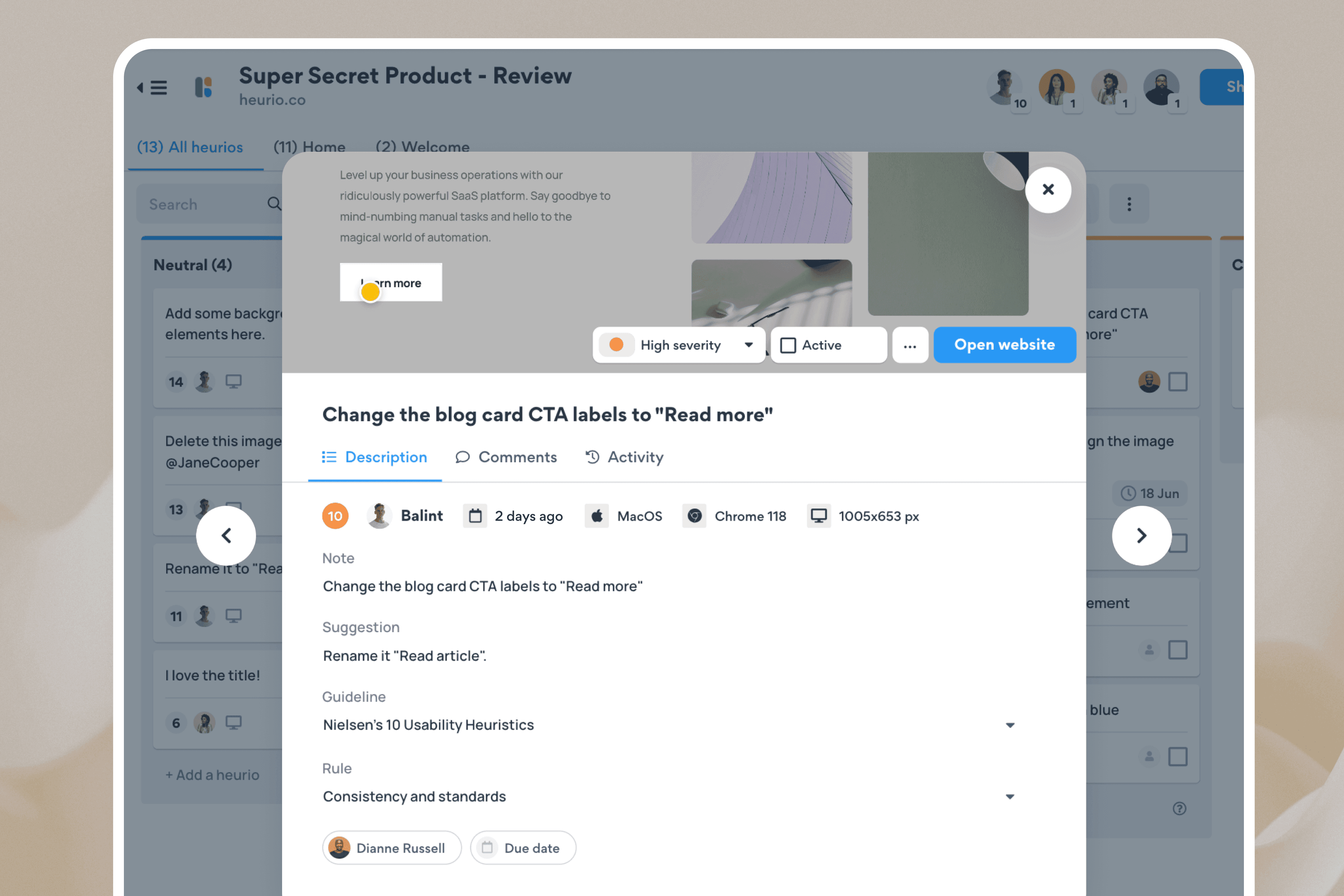 The resulting solution, Heurio, successfully balances simplicity and functionality. Users now easily annotate live websites, conduct detailed heuristic evaluations, and collaborate efficiently through the platform’s comprehensive project management features. With the advanced Organization plan, larger teams benefit from enhanced project tracking, detailed reporting, and streamlined team coordination, significantly improving overall productivity and UX quality assurance processes.